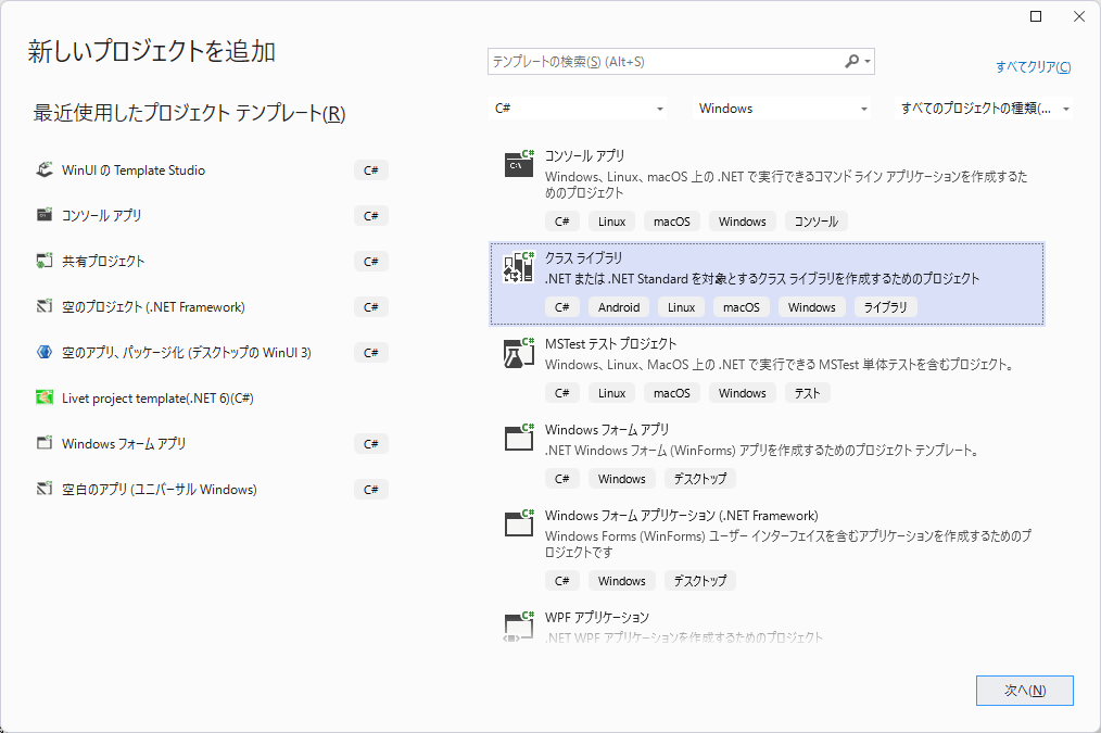 デフォルトの中身は不要なので、なるべく空に近いテンプレートでプロジェクトを作成します。今回は「クラスライブラリ」にしました。