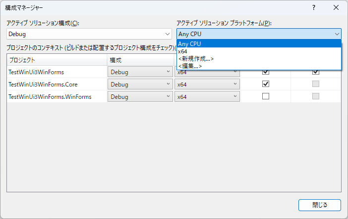 GitHub からダウンロードしたソリューションを開くと、構成マネージャーに「Any CPU」が追加されている場合があります。