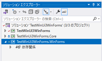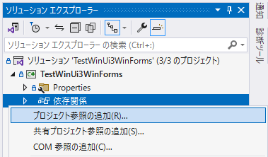 メインプロジェクトで WinForms を利用するには、メインプロジェクトの「依存関係」からプロジェクト参照の追加をします。