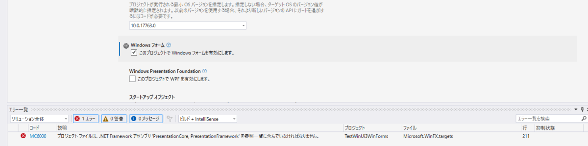Template Studio for WinUI で新しいソリューションを作成し、プロジェクトのプロパティーで「このプロジェクトで Windows フォームを有効にします」をオンにすると、ビルド時に MC6000 エラーが発生します。
