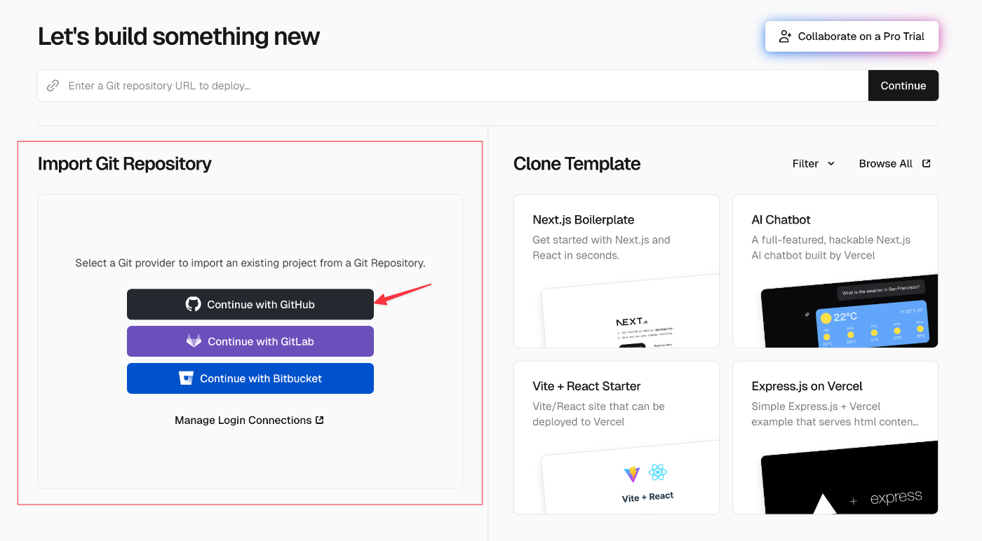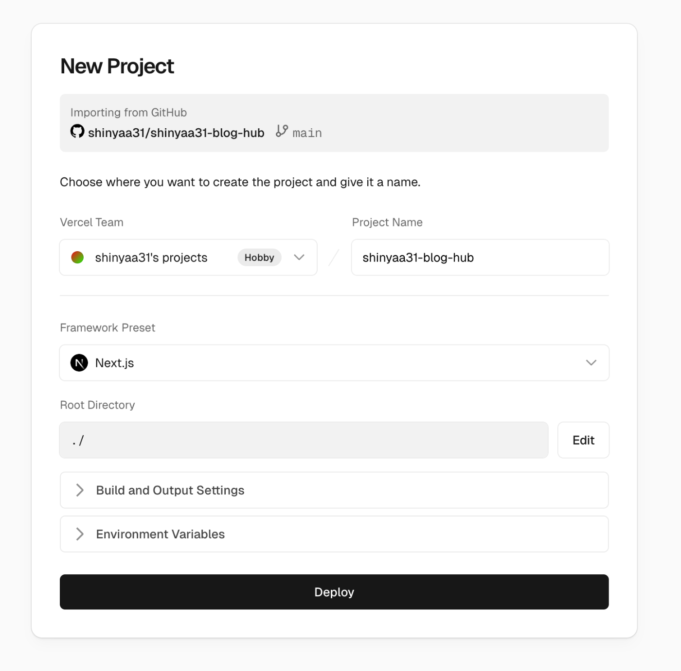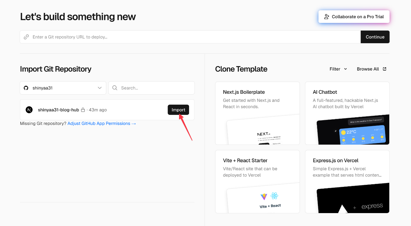 対象リポジトリをVercel環境にインポートしていきます。[import]を選択し、