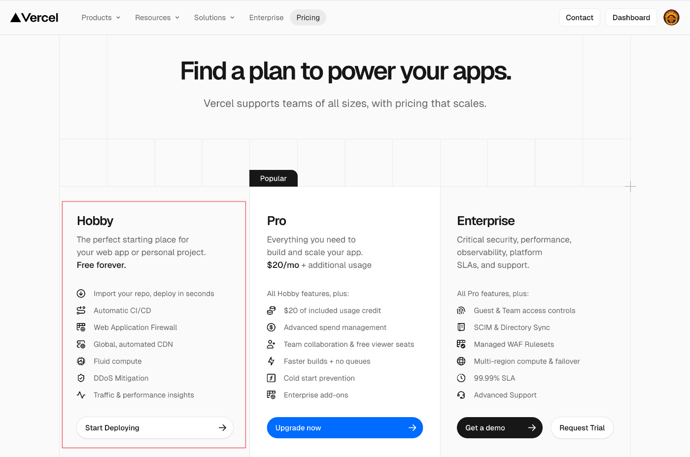 作成したアプリケーションをパブリックでアクセス出来るように外部サービス環境に展開します。今回はVercelを利用することにしました。最低限利活用が出来れば良いので無料のHobbyプランで進めました。