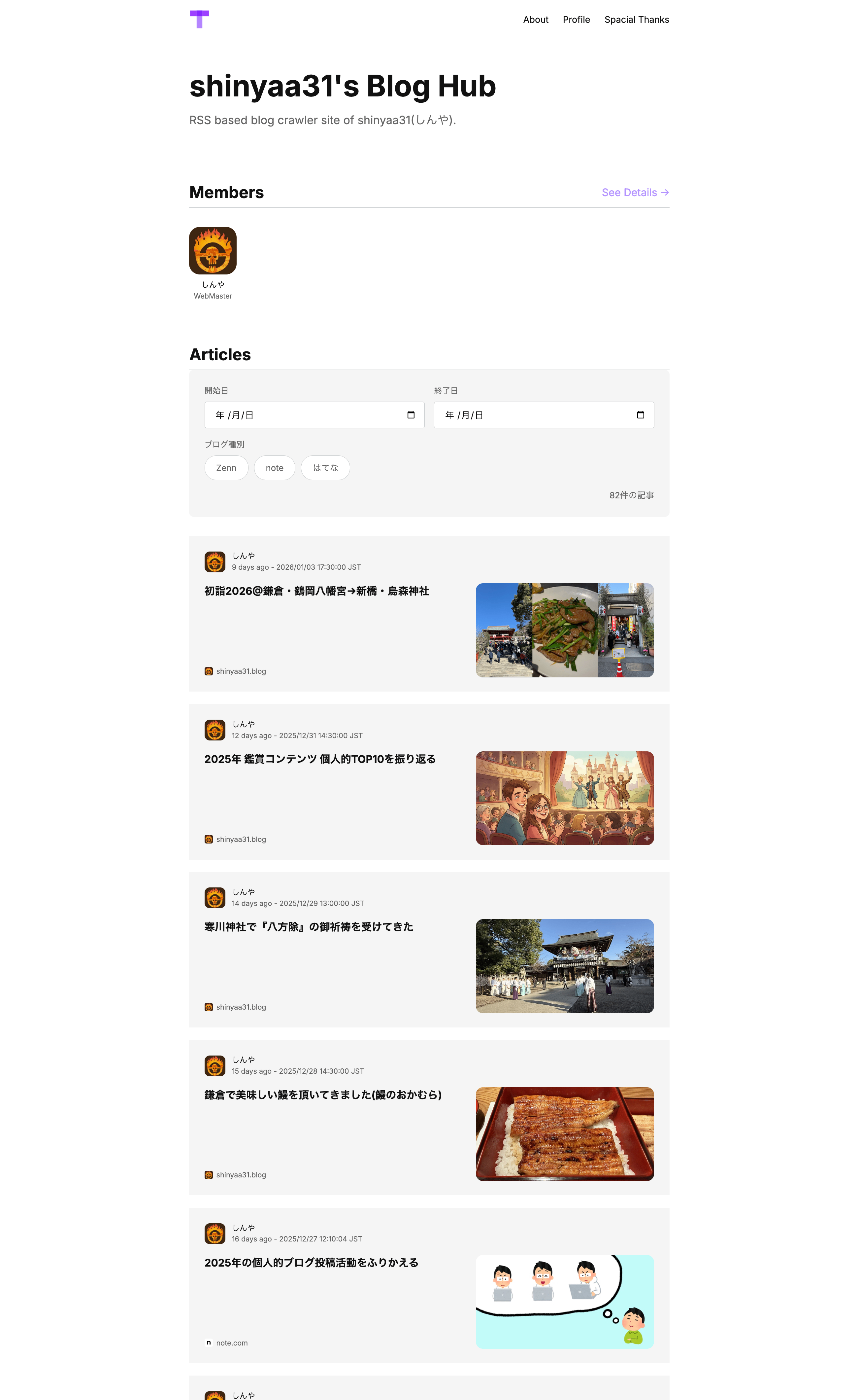 個人的に運用している各種ブログの投稿情報(RSS)を集約するサイトをNext.jsとVercelで展開しました