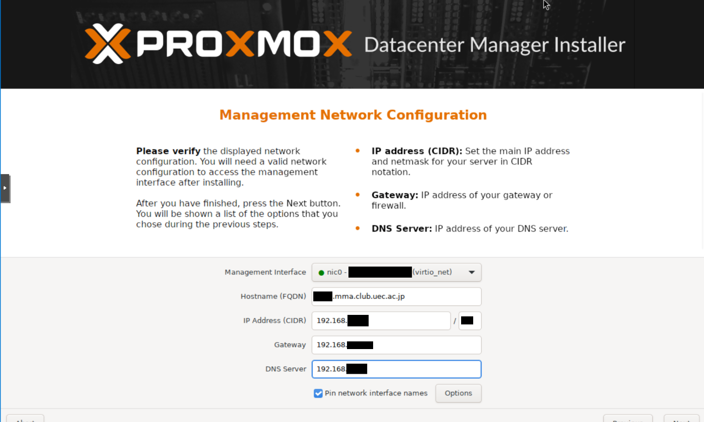 VMを起動してProxmox Datacenter ManagerのISOからインストールします。といっても,他のProxmox系OSとやることは変わりません。