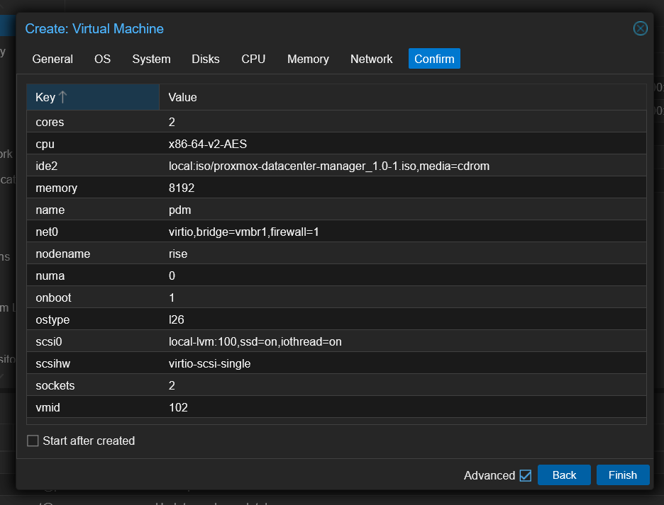 Proxmox Datacenter ManagerをインストールするためのVMを用意します。cloud-initには対応していないので,すべて手作業で設定します。ISOファイルの指定も忘れないでください。