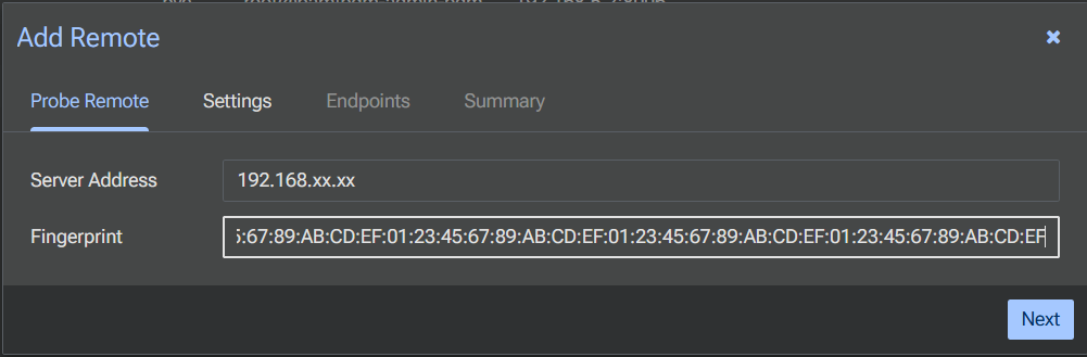 ノード追加フォームが表示されます。Server AddressにノードのIPまたはホスト名,Fingerprintに先ほど取得したフィンガープリントを入力します。入力したらNextをクリックします。