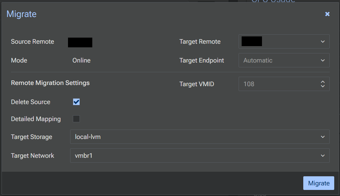 Migrateの設定画面が表示されます。Target Remoteから移行先のノードを選択します。ノードをまたぐ場合,移行先でのVMについてストレージやネットワークの設定もここでできます。設定したらMigrateで移行しましょう。