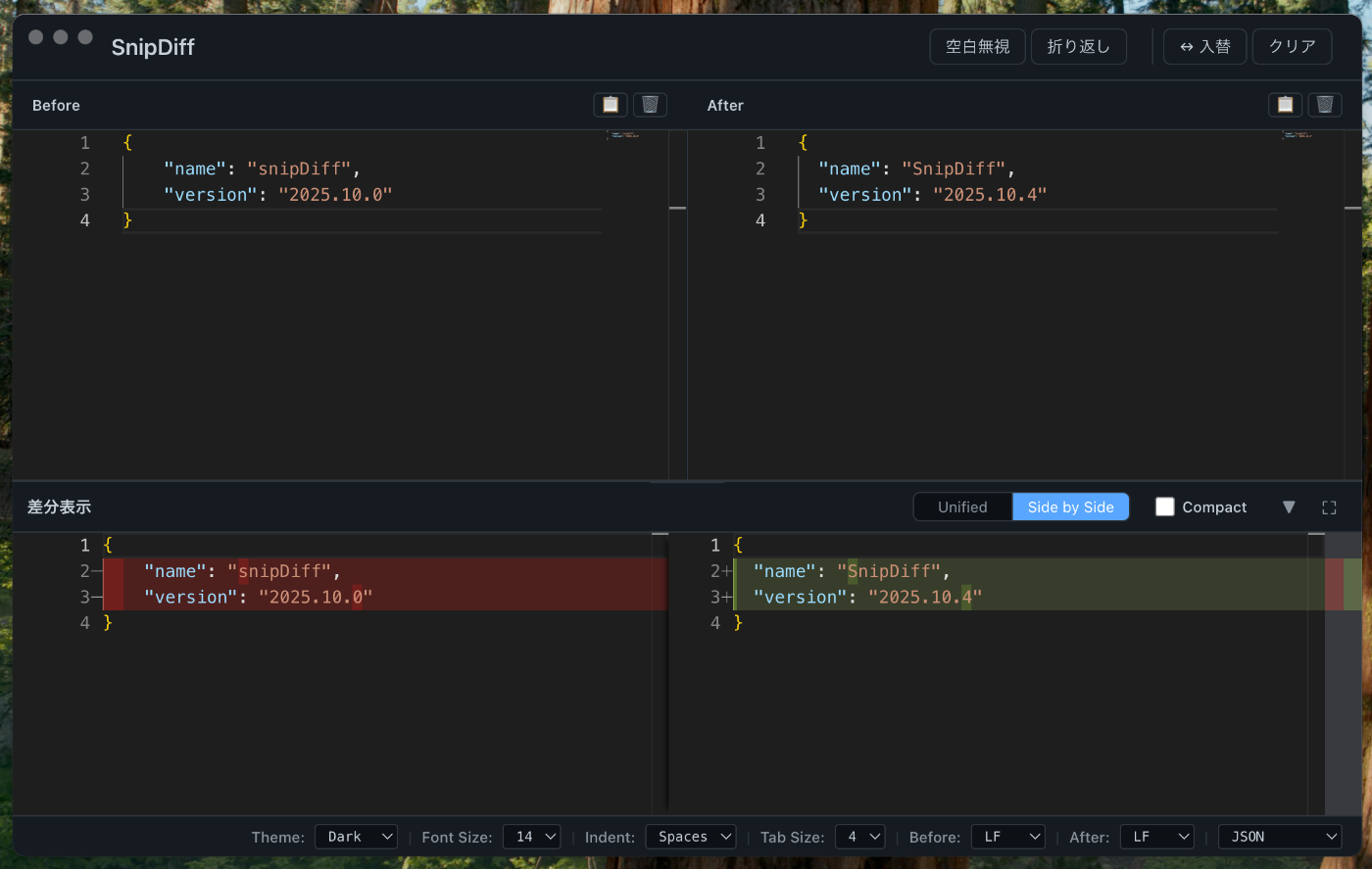 SnipDiffは、ファイルに保存せずに未保存のテキスト同士を比較できるmacOS向けのデスクトップアプリケーションです。スニペット(コードや文章の断片)を手軽に比較したいという思いから生まれました。