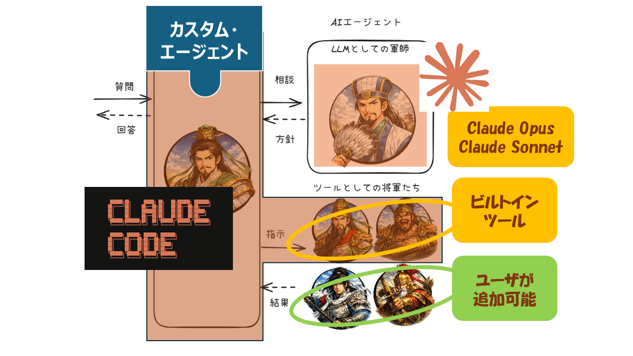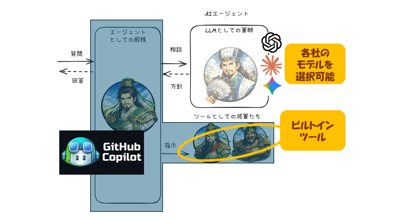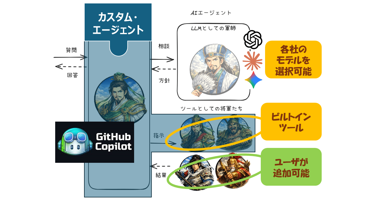 このように、ビルトインの「劉備」、ユーザーが都度選べる「軍師」、そしてビルトインの「将軍たち」という構成が、GitHub CopilotのAgentモードの最初の状態です。これに加えて、ユーザーは「殿=エージェント」をカスタマイズしたり、「将軍たち」を追加したりすることができます。