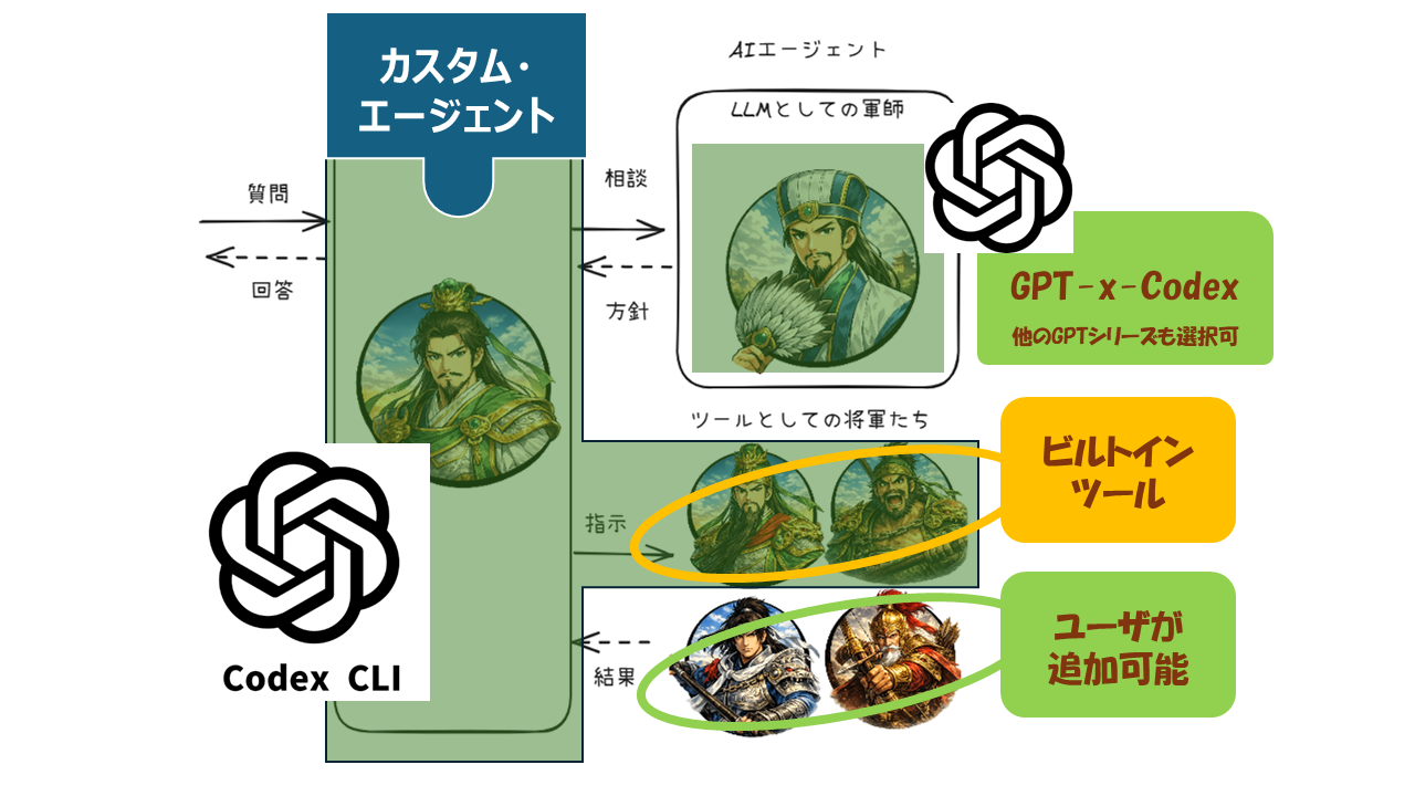 Codex CLIは、Claude CodeやGitHub Copilto 同様に、ユーザーの指示に基づいてコードを生成するエージェントです。三国志の例で言えば「劉備」です。この場合、LLMは「GPT」シリーズのみを選択できます。軍師は常に「孔明」ということになります。(GPTシリーズであれば、Codexシリーズでなくても選べます。)