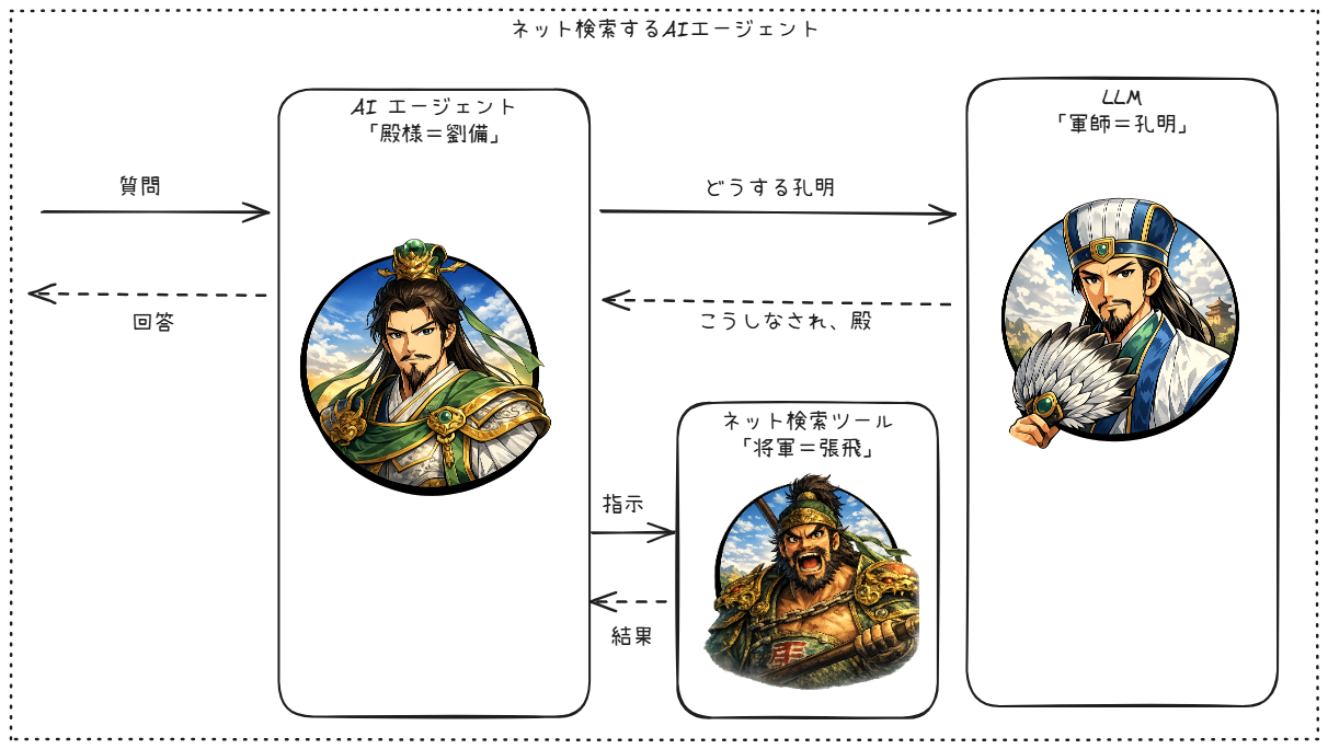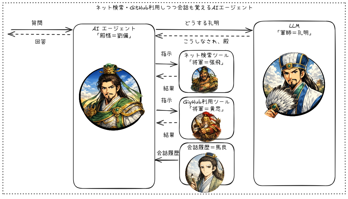 - 天才軍師・諸葛孔明=LLM:劉備に何かと助言するが、決して自分が直接前面に出ない