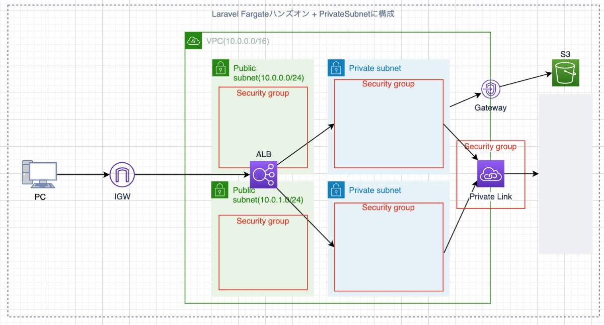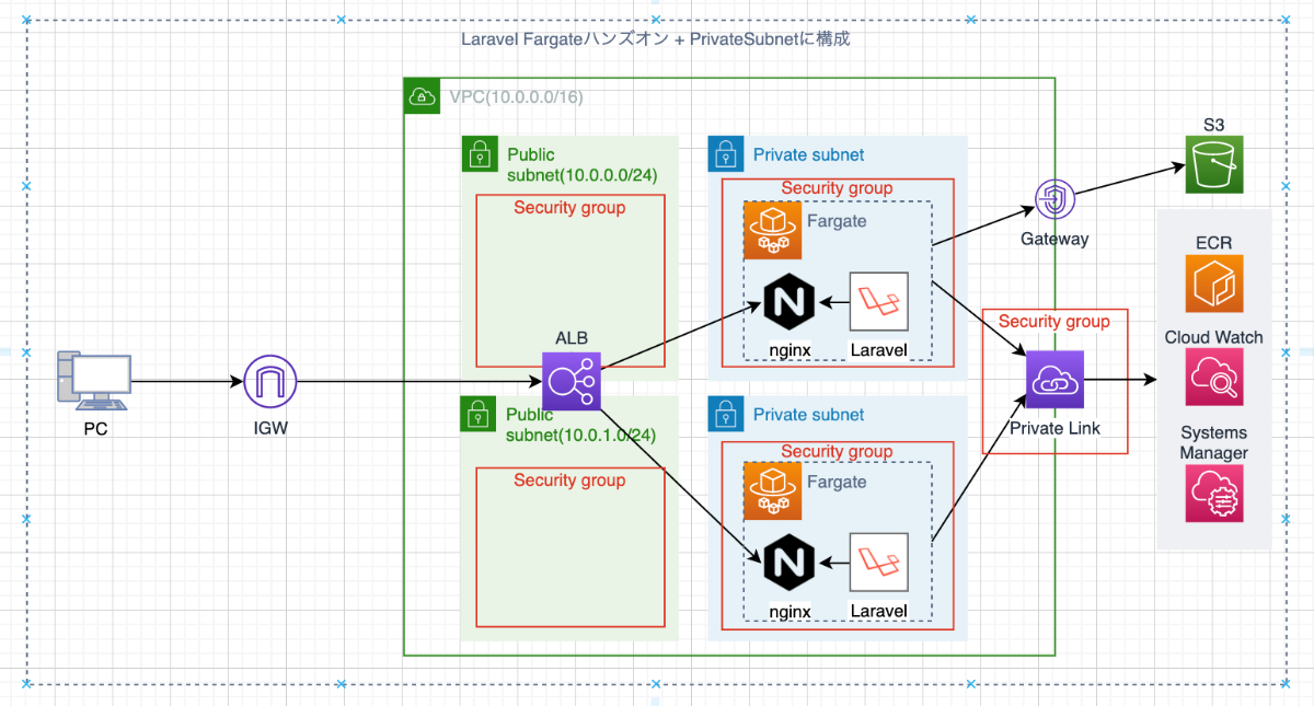 プライベートサブネット内のコンテナについて、インターネットからのWebアクセスはALBのみでOKだが、ECRからイメージをPullするには、コンテナからAWSリソースへアクセスするための別口が必要となる。そのためにPrivateLinkをVPCに設定。