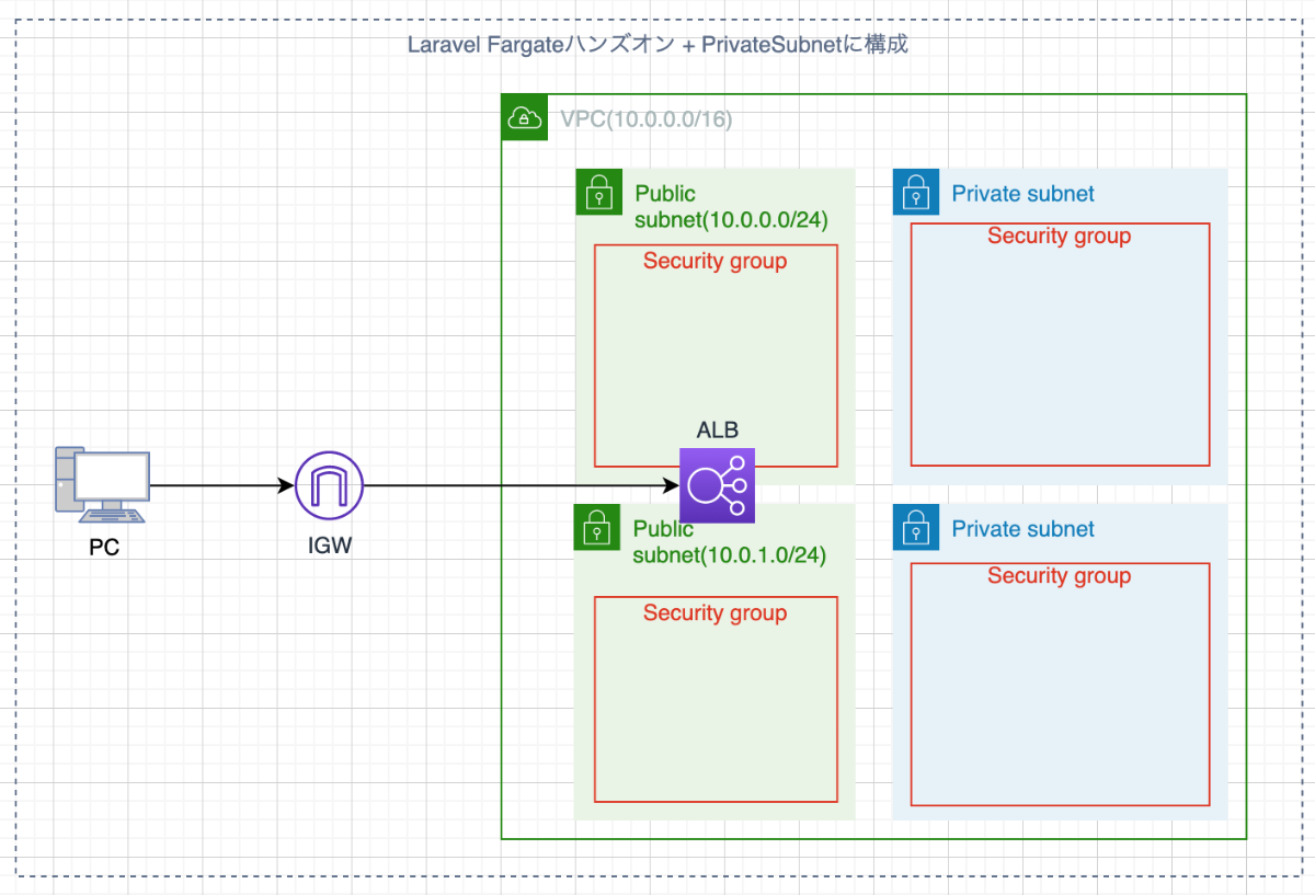 ALB用とFargate用でそれぞれ作成名称 タイプ ソース ALB-sg HTTP、HTTPS 任意の場所 Fargate-sg HTTP ALB-sg -