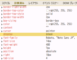 スタイル(Styles)パネルには書いていなくても、計算済みタブではしっかり block になっていました。