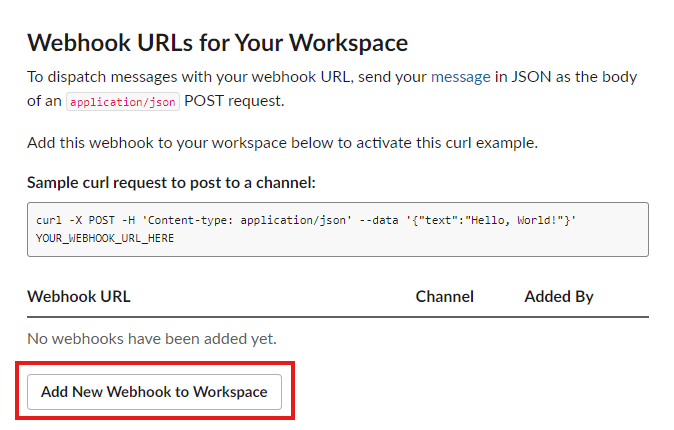 "Webhook URLs For Your Workspace"のメニューが画面下部に追加されるので、"Add New Webhook to Workspace"をクリック