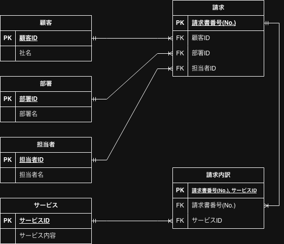 洗い出したエンティティに、請求書のフィールド(項目)を紐付け、関係を整理し、ER図を描きました。主キーと外部キー以外のカラムは、省略しています。