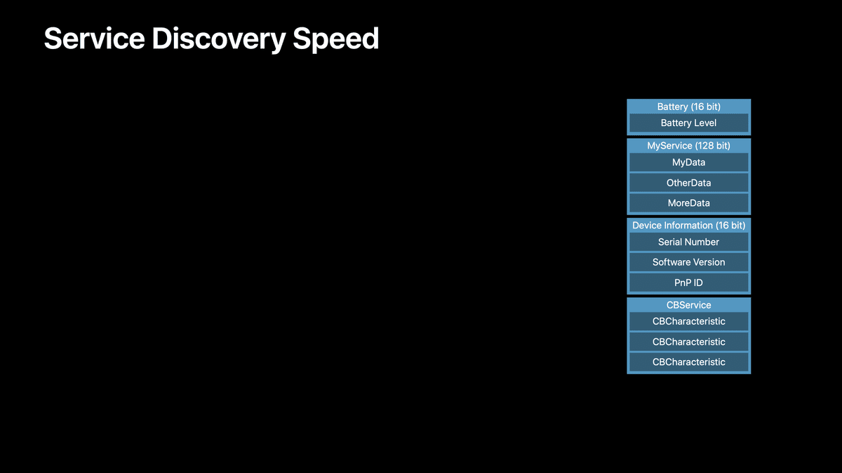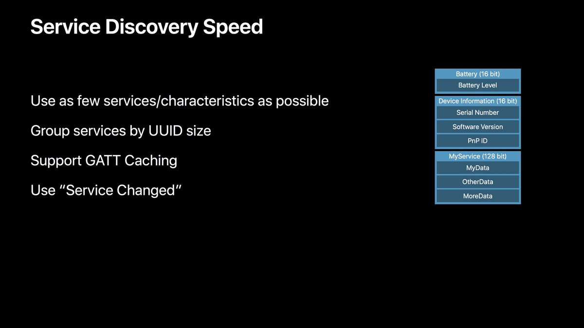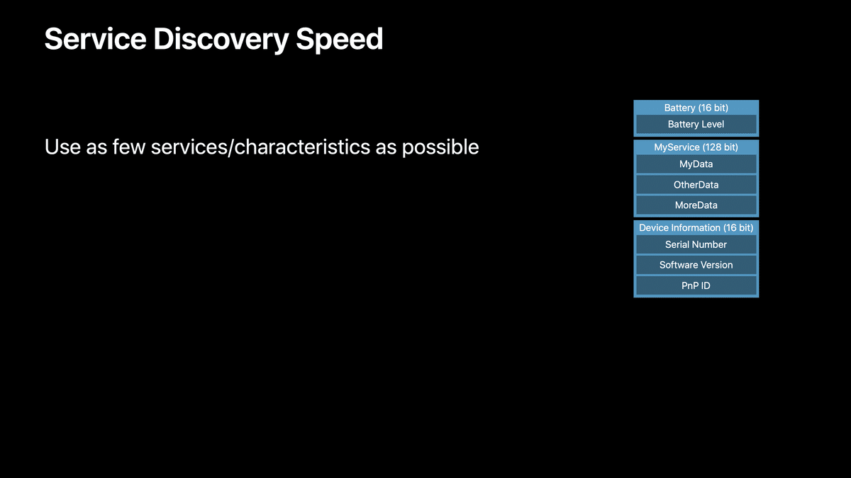 そのため、不要なサービスを取り除くか、複数のキャラクタリスティックを1つのサービスに詰め込むことで、ユーザーがアクセサリーに接続するたびに、サービスの発見をスピードアップすることができます。