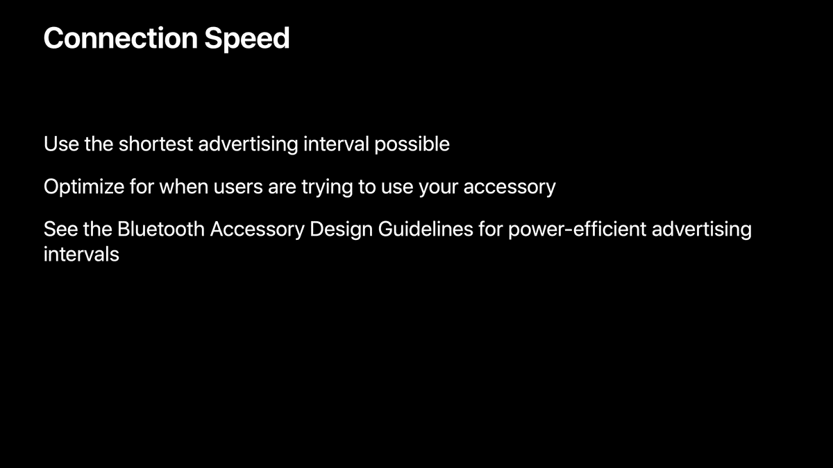 Now using a short advertising interval takes extra battery for your accessory, so you can't do that all the time but what we strongly recommend is if you know through any means necessary, through the user touching the accessory, user picking it up, accelerometer, buttons, use that as an indication to start doing aggressive advertising and then you can go into a lower advertising interval later when you're trying to save battery.
