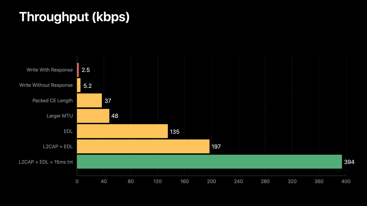 さらに、L2CAPと拡張データ長を使用してソフトウェアの制限を排除すれば、ほぼ200kbpsまで改善できます。