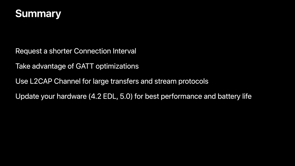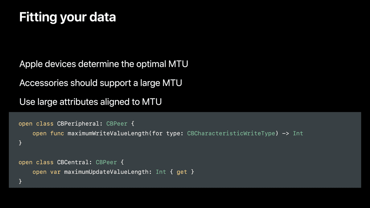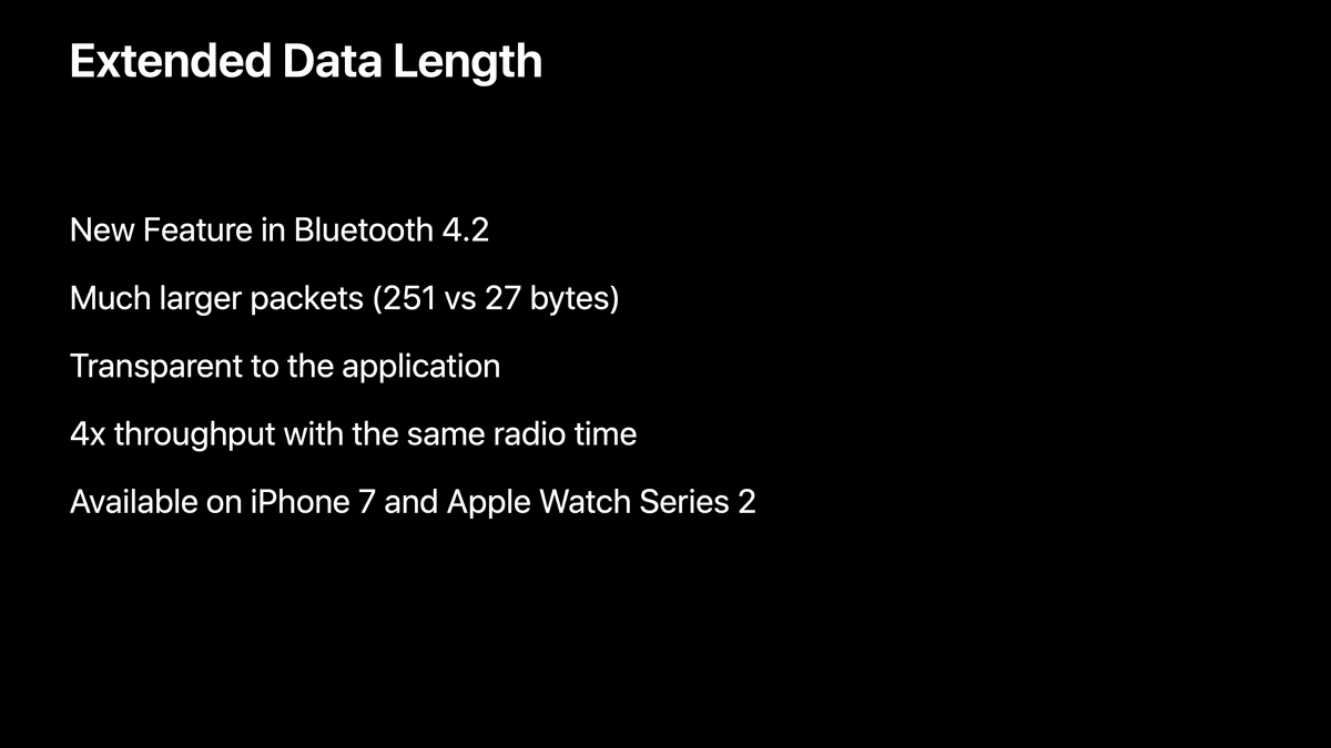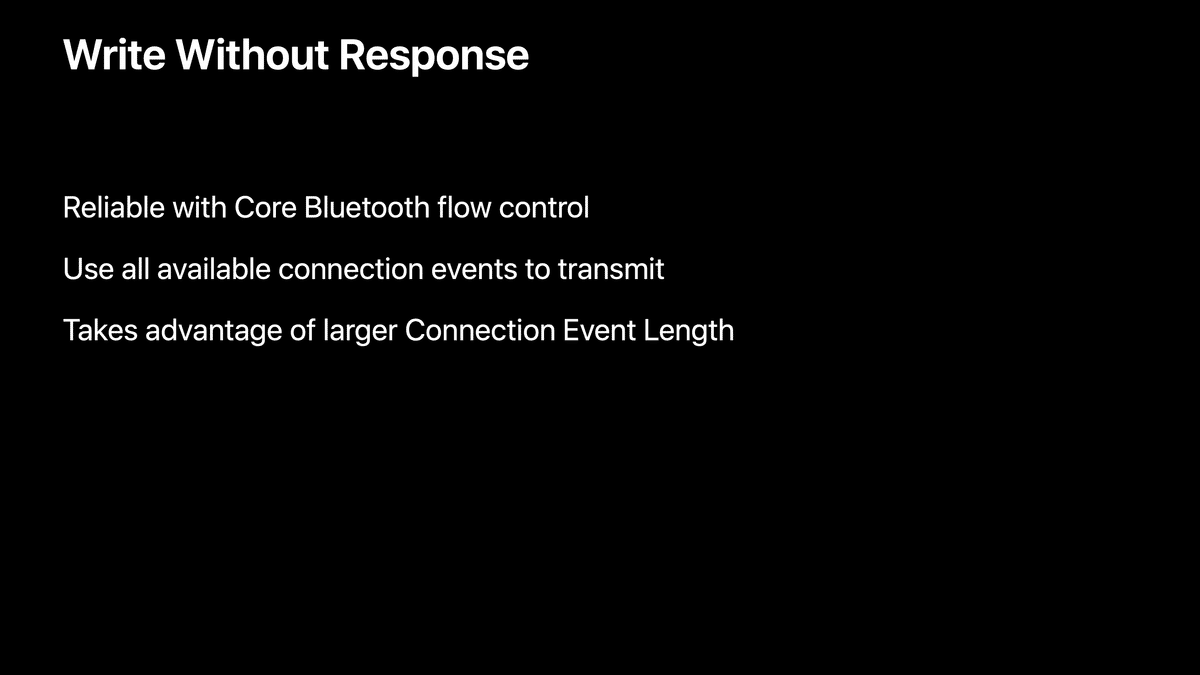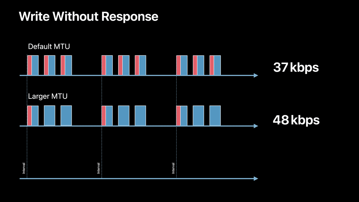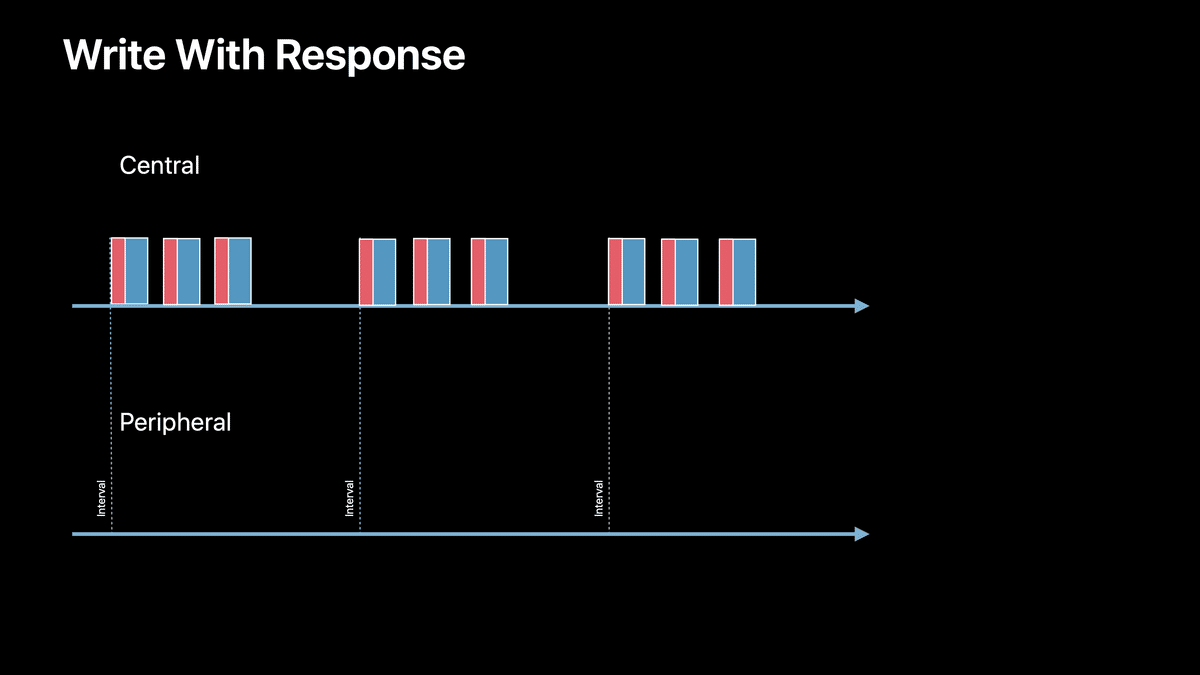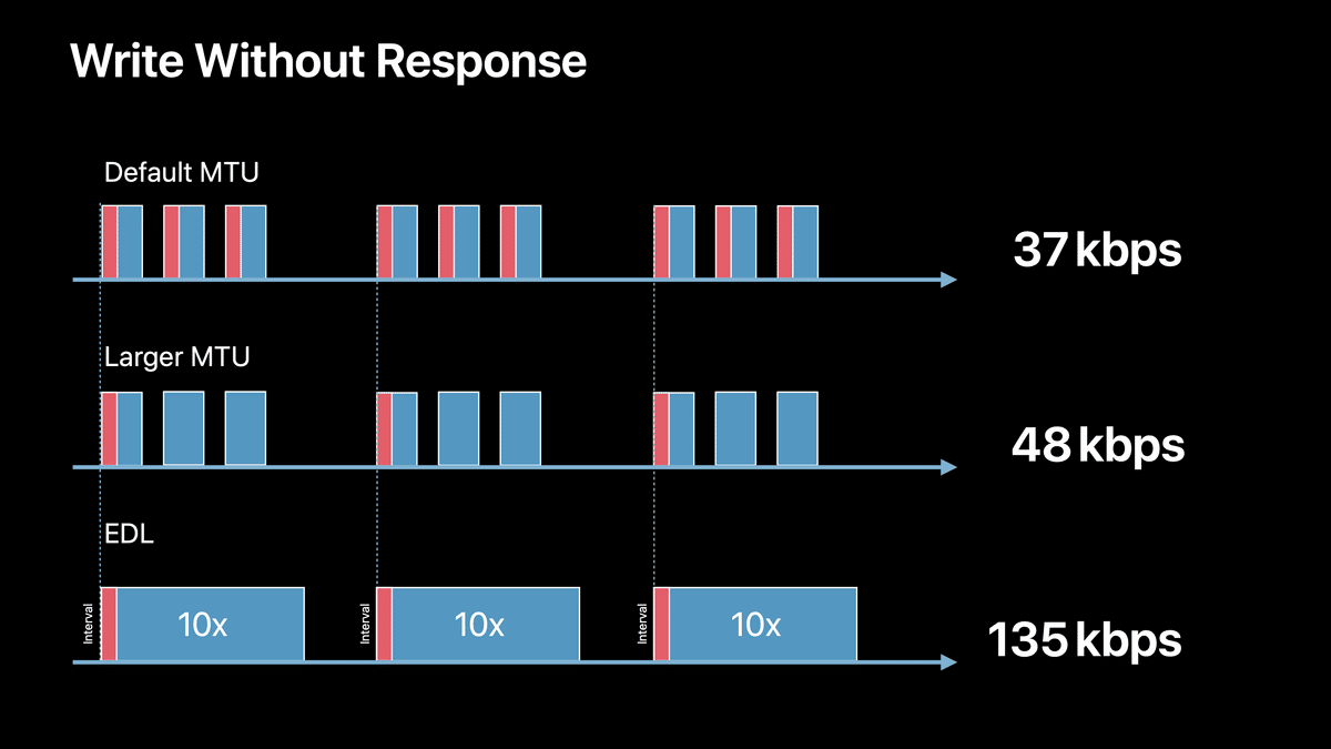 And you can use the Write Without Response to make sure that Core Bluetooth is sufficiently buffered so we can sufficiently buffered so we can use all of the available connection events to send all of your application data.