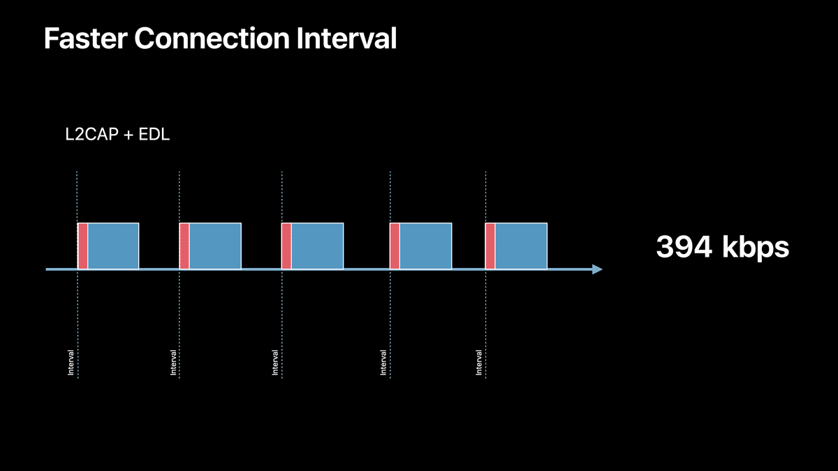 All of the discussion thus far assumes a connection interval of 30 ms, but in Core Bluetooth we made a change to lower the connection interval minimum for iOS to 15 ms, so when your firmware is updating your device you can ask for a parameter update request and set the interval min and max to 15 ms in which we will honor.