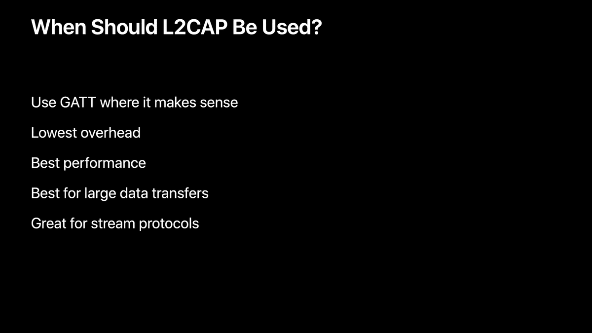 If you're trying to do things like streaming protocols or transfer a large amount of data, L2CAP Channels are a great fit for that and we think that's a really powerful feature that's going to help you build even better accessories.