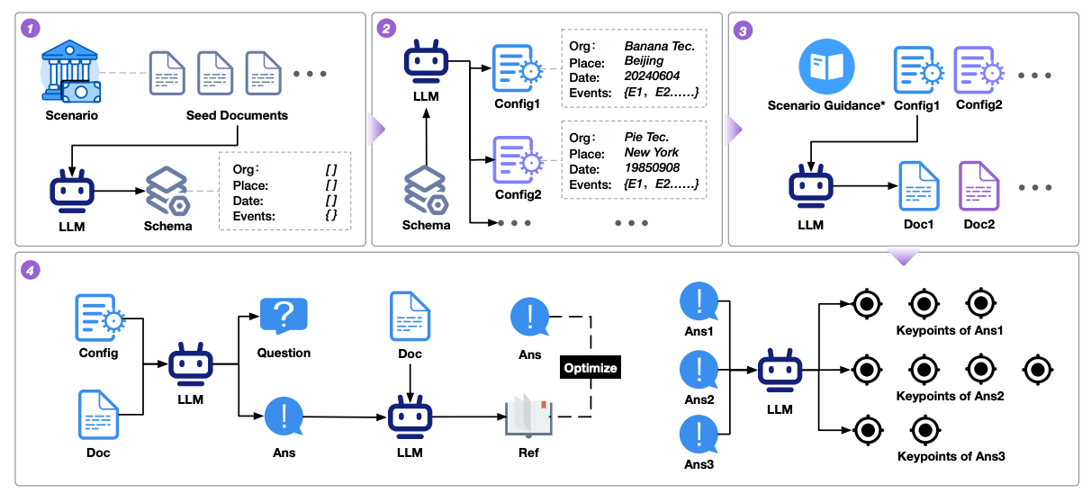 LLM(GPT-4oモデル)により、設定ファイルから特定のシナリオに合わせて変換することで、文書を生成します。最終的に、これが参照情報となって質問と回答が生成されます。