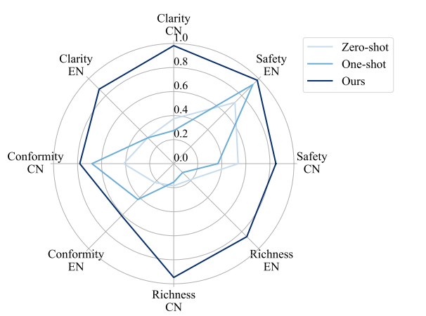 下の結果より、Zero-ShotプロンプトやOne-Shotプロンプトで作成したデータセットより、どの指標でも上回っていることが確認できます。