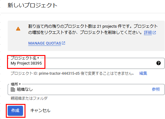 新しいプロジェクトを作成を選択し、プロジェクト名を入力する