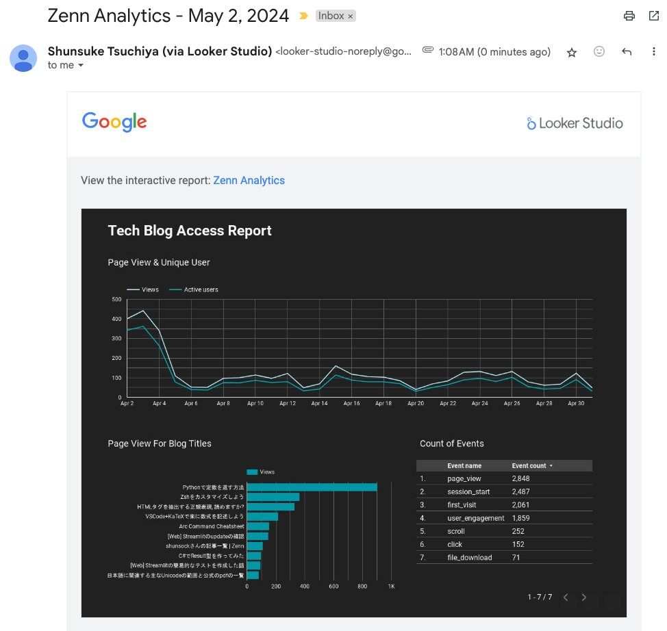 以下は私が実際に作ったレポートです. Zennの私の記事ページへのアクセスデータを可視化しています. 直近だとPythonの記事にアクセスが集中しているようでした.