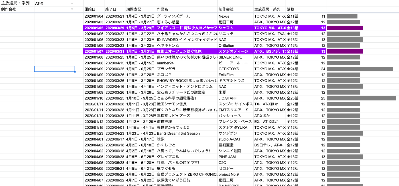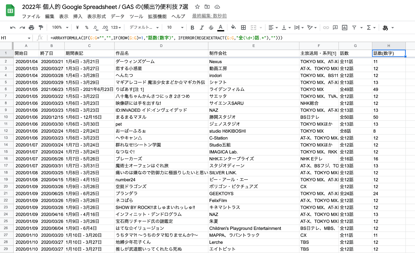それぞれの工夫の価値が伝わりやすいように、例として Wikipedia の 日本のテレビアニメ作品一覧 (2020年代 前半)からデータを引用してスプレッドシートで加工するシチュエーションを想定して もろもろ書いています。それを踏まえてご覧ください。