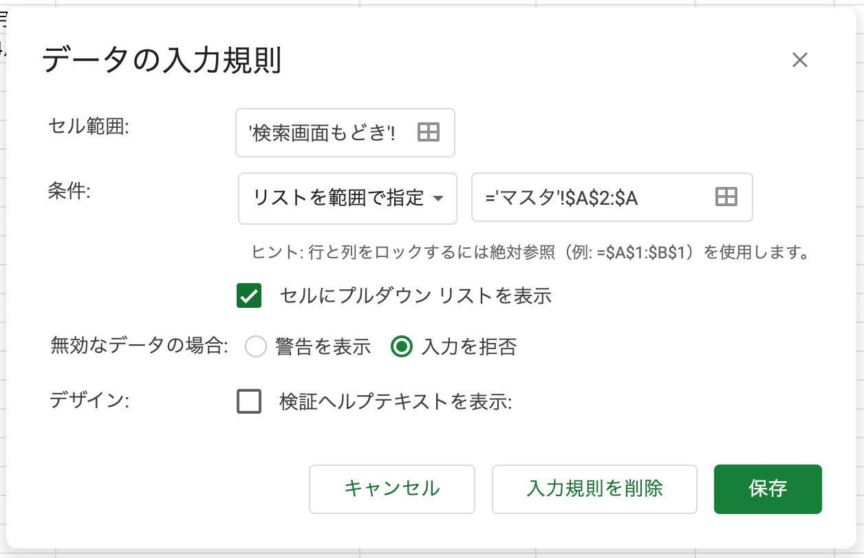 その上で、 B列を 「制作会社」のマスタにしておき、 検索シートでデータの入力規則の対象マスタをこの範囲に設定しておきます。