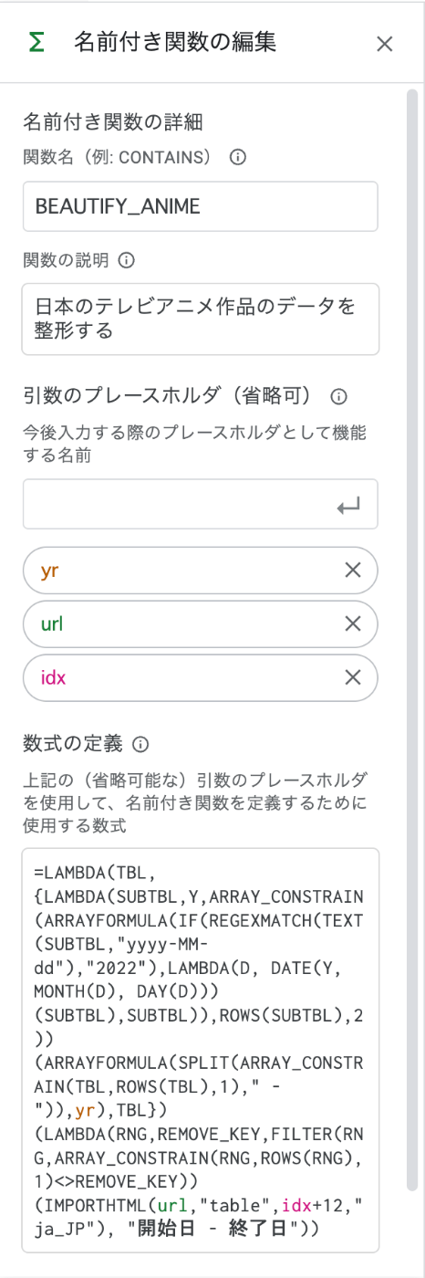 しかし、これは wikipedia の一つの表(1クール分) しか読み込めておらず、さらにこれを縦に結合していく必要があります。 この複雑な関数を重ねていくと、可読性もメンテナンス性も下がるので、ここで名前付き関数の出番です。