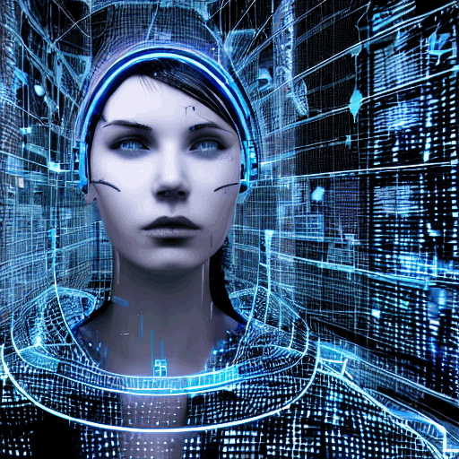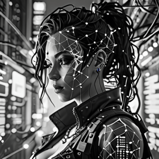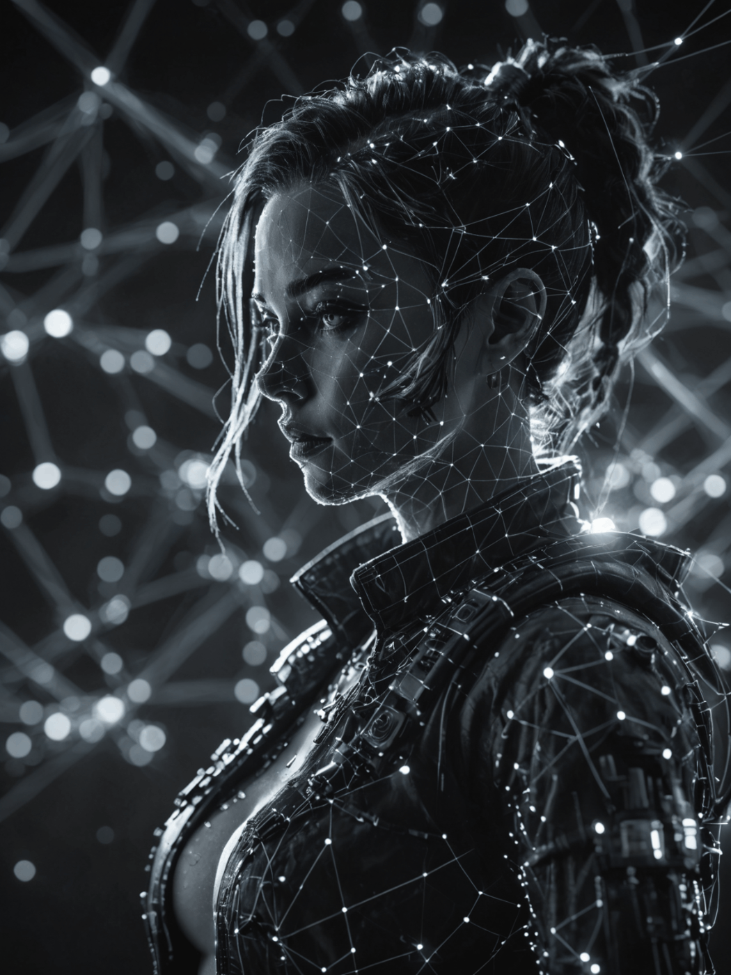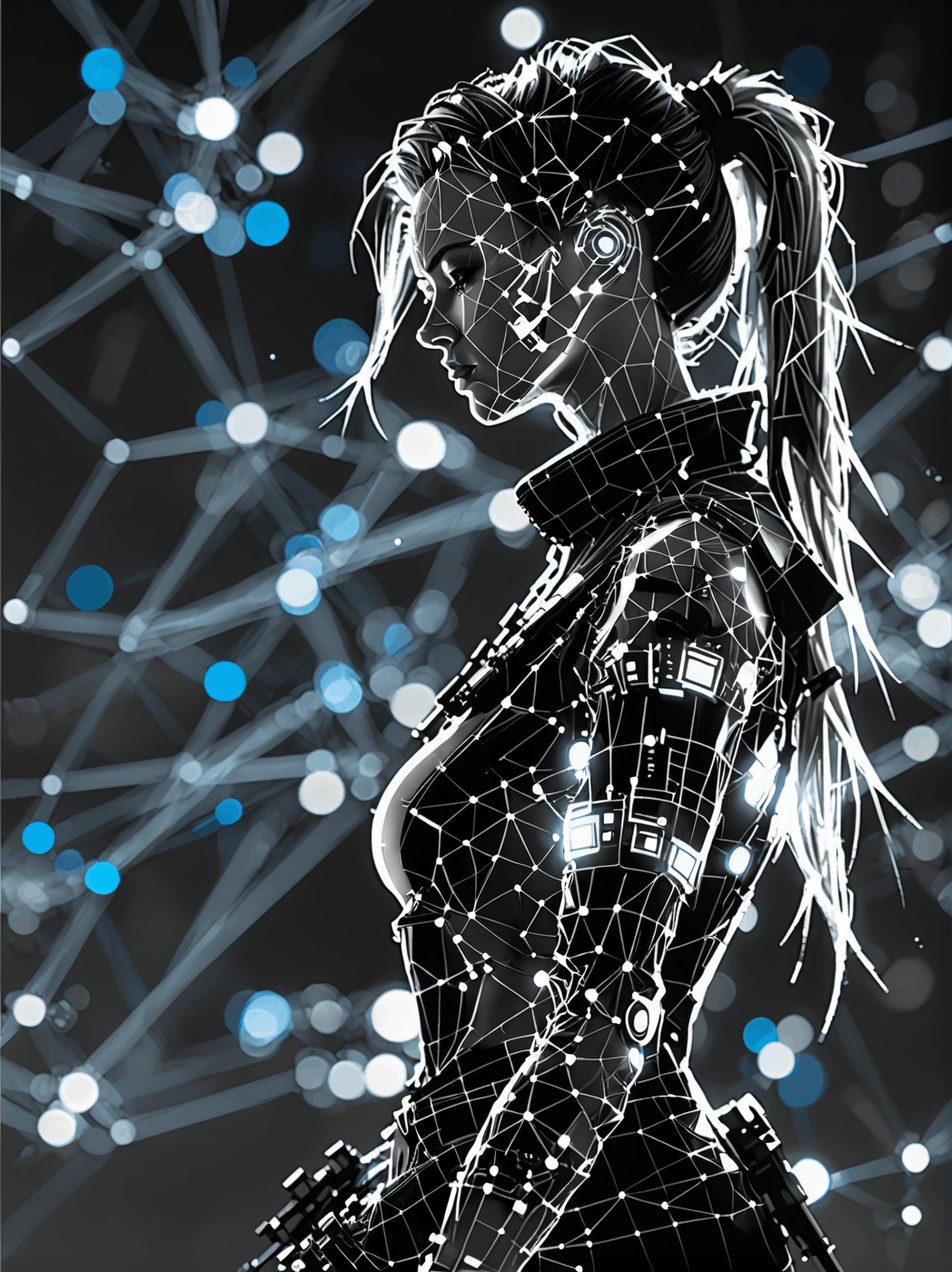 dataviz style, black and white network data visualization in the shape of a cyberpunk girl, masterpiece , hyper detailed, unreal engine, blue tones, stars lora:dataviz_style_xl_v1:1