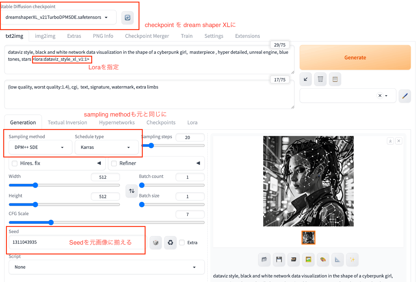 一旦、negative promt とかすぐにできるところから再現してみる。