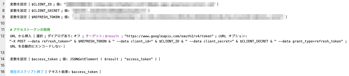 ここからはFileMakerを使います。GoogleのAPIを利用するにはアクセストークンが必要ですが、アクセストークンは一定時間経つと失効してしまうので、実際にはリフレッシュトークンを利用して毎回生成します。リフレッシュトークンからアクセストークンを生成するスクリプトは下記のとおりです。
