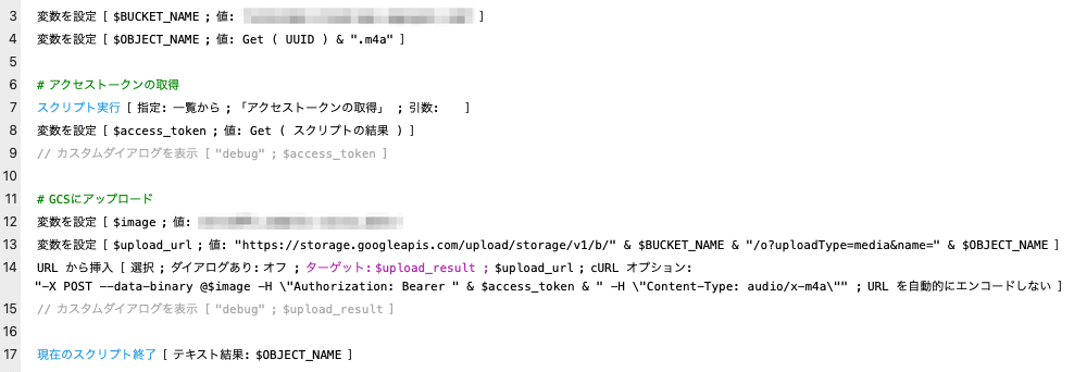 アクセストークンが取得できたらファイルをGCSにアップロードします。アップロード対象のファイルは事前にオブジェクトフィールドに格納してある想定です。スクリプトはこちらです。