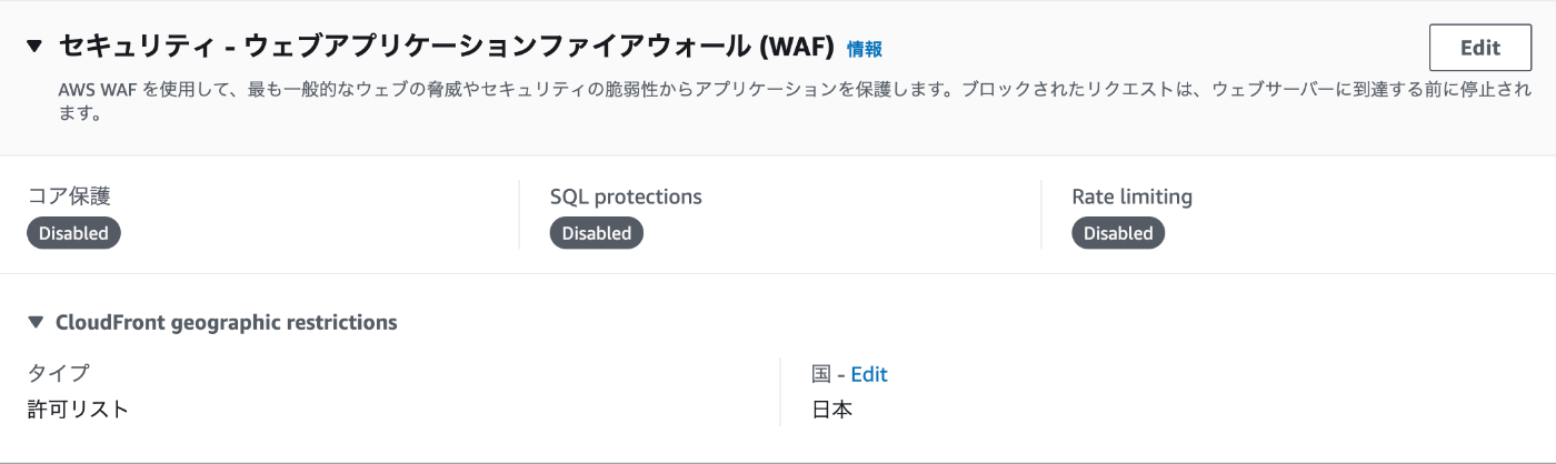 CloudFront -> ディストリビューション -> 任意のディストリビューション ->Security