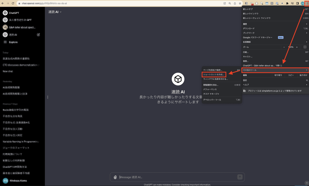 今回は、技術記事を素早く要約するためのコンセプトデモを GPTs で作成してみました。「要約して、と言われたら、次の記事を要約してください。【記事内容…】」といったシンプルなプロンプトを与えただけの非常に単純なものです。作成済みの GPTs を Chrome で開き、三点リーダー → その他のツール → ショートカットを作成 と進むと、GPTs をコンパクトな UI で表示することもできます。