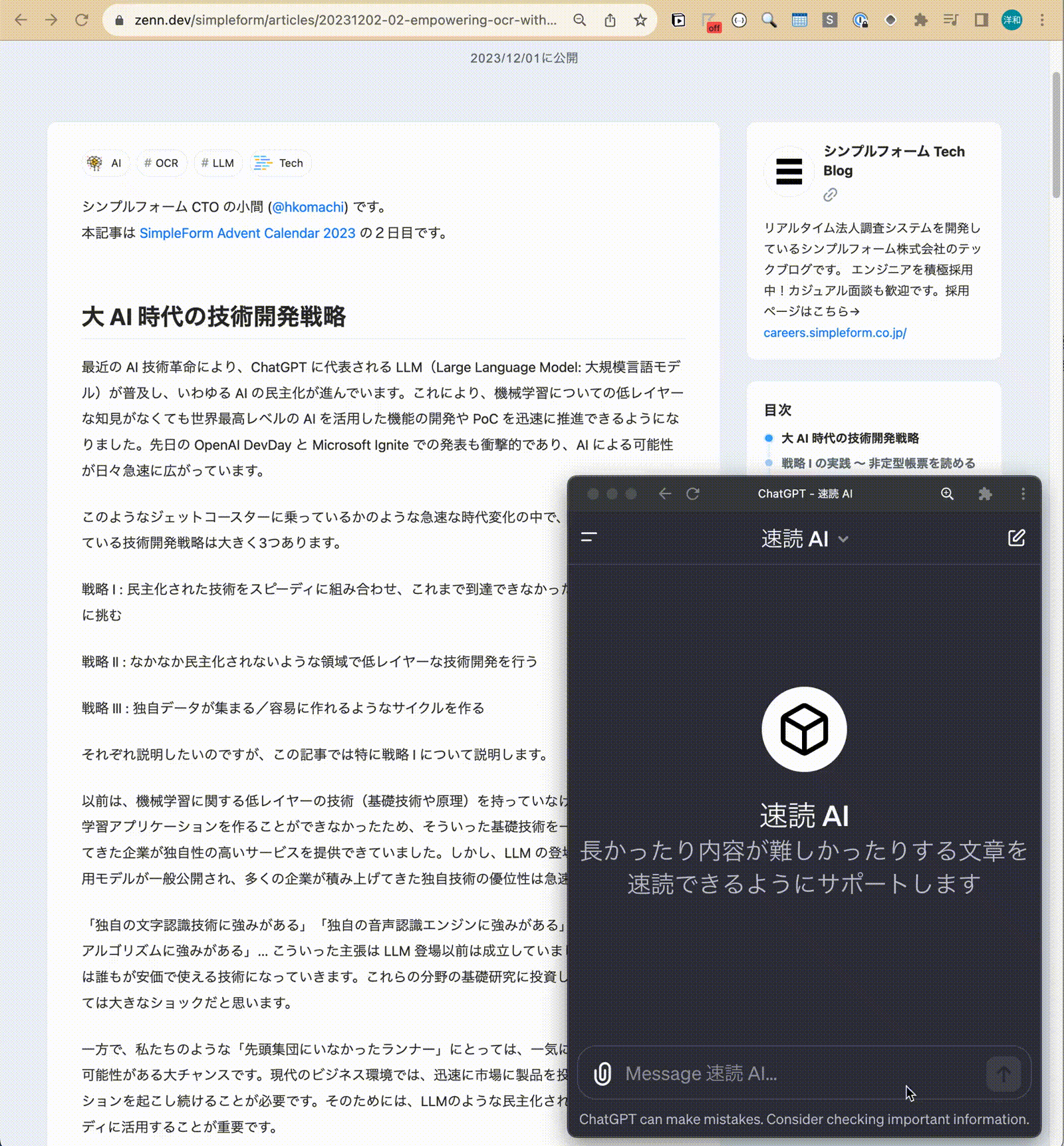 世はまさに大生成 AI 時代。最近の生成 AI の進化は目覚ましく、これまでに無かった生成 AI プロダクトの市場が急速に広がっています。シンプルフォームでも、先日 (2023年11月6日) の OpenAI Dev Day で発表された GPTs を用いて、生成 AI アプリケーション開発の PoC を高速に回す仕組み作りに挑戦しています。