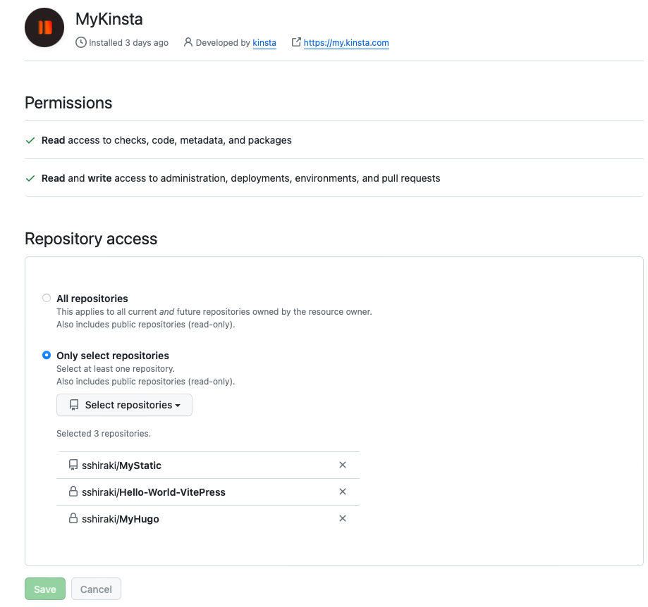 リポジトリの割り当ての時にgithubのアクセス権限を設定する必要があります。リポジトリを選択する蘭にフォーカスすると「GitHubの権限を編集」が表示されるので、選択するとGitHubの権限管理ページに飛びます(設定後リロードしすると選択項目に反映されます)。