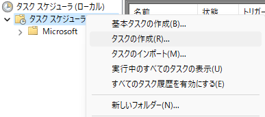 タスク スケジューラ ライブラリを右クリックし、タスクの作成を選択