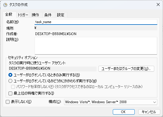 Windowsのタスクスケジューラで作成されたタスクは、タスクの実行時に使うユーザーアカウントを指定することが出来るため、Jenkinsからschtasksコマンドを使ってタスク経由でバッチファイルを実行してみます。