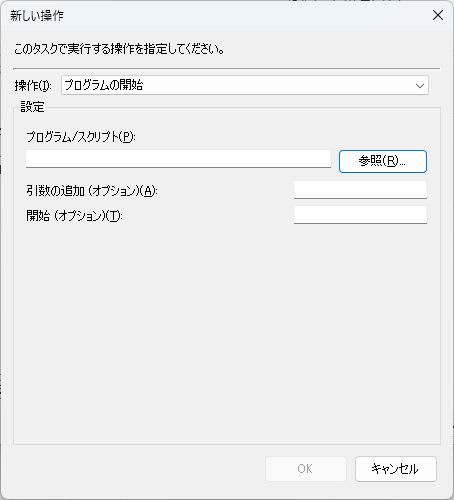 操作でプログラムの開始を選択し、プログラム/スクリプトに実行したいbatファイルを指定