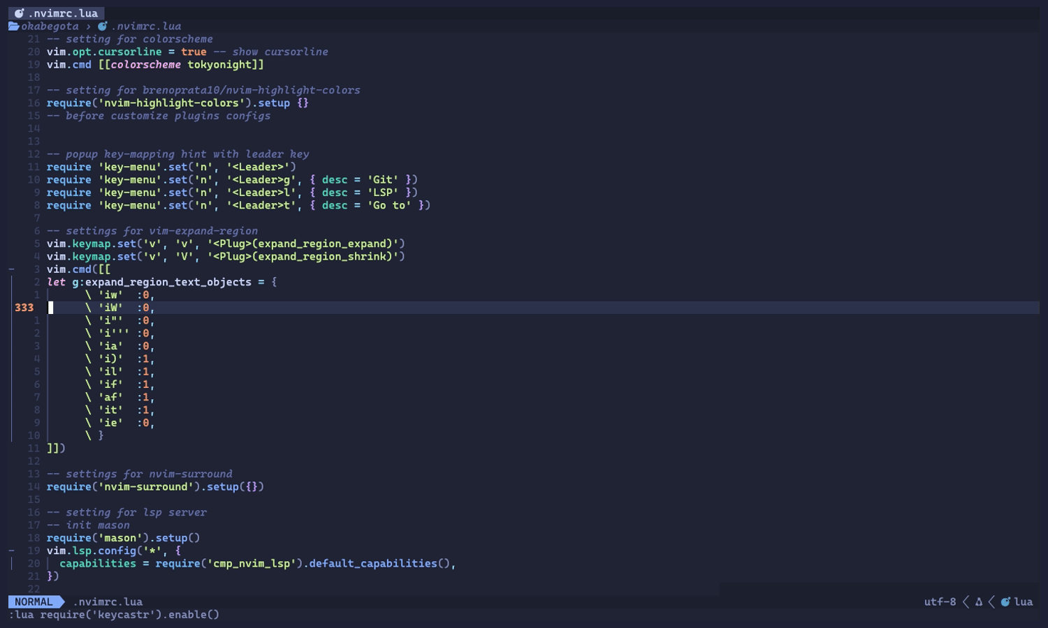 特にLSP系列には<leader>lもしくは<leader>t(移動系はこちら)から始まる大量のバインドを割り当てており、key-menu.nvimが大活躍しています。