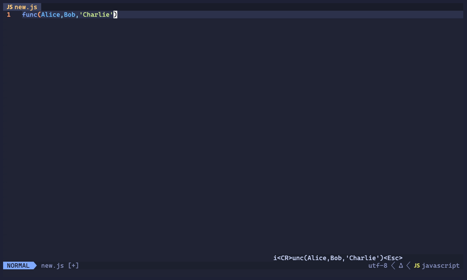 この中で特に便利なのがvia,vaaというtextobjです。このtextobjは関数の引数(Argument)に対して機能します。例えばcall(Alice,Bob,"Charlie")となっている場合に、Aliceの上だとAlice,Bobの上ではBob,"Charlie"の上では"Charlie"を正しく選択してくれます。
