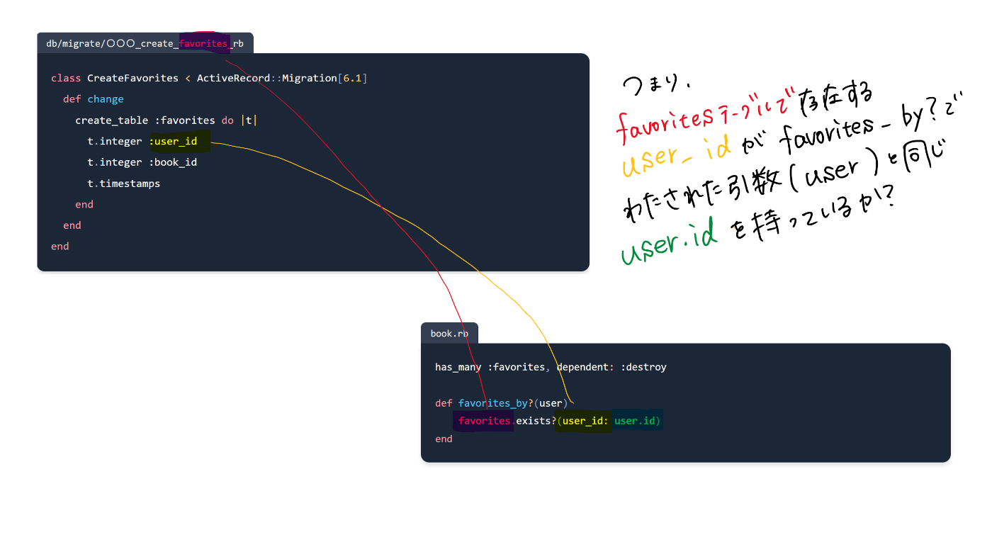 このメソッドを用いることで引数で渡されたユーザーidがfavoritesテーブルに存在(exists)してるか?どうかを確認できる。