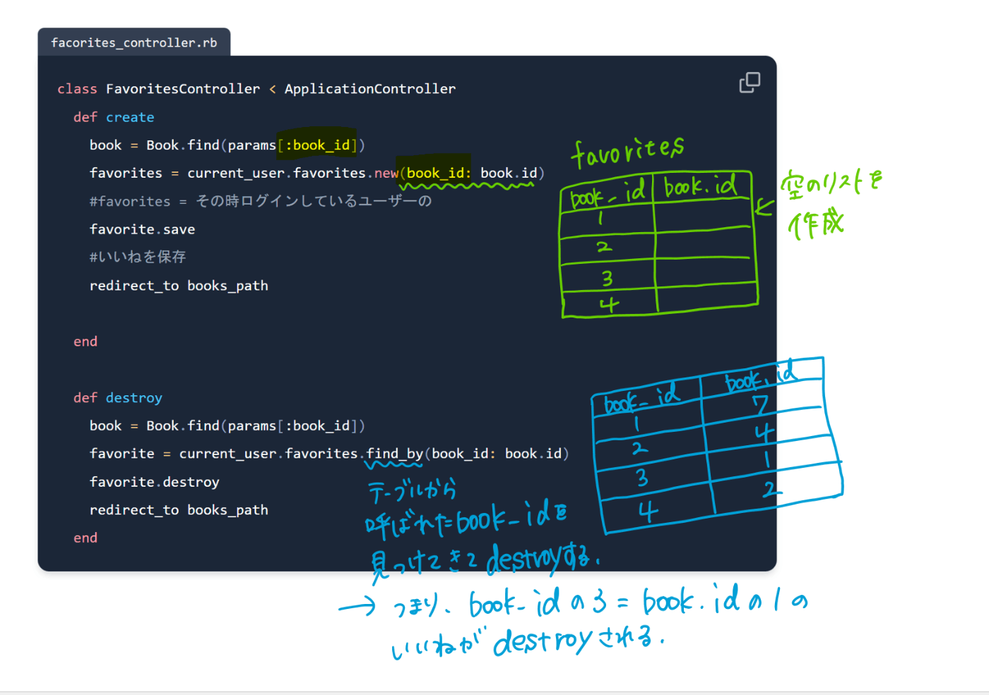 今回はresourceで(s)をなくすことでURLに/:idが含まれなくなる。→いいね♥機能の場合、1人のユーザーが1つのbookにいいね♥できるのが1回のみなので、URLにparams[:id]を使わなくてもいいためresourceになっている。