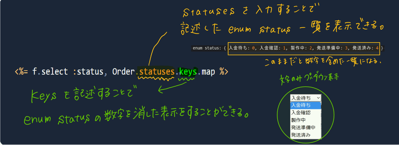 <%= f.select :status, Order.statuses.keys.map {|k|k]} %>Kがどういう役割しているかわからなかったのでそのまま残してみてこのような記述になりました。