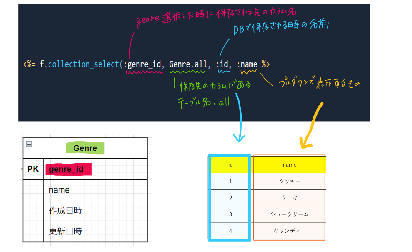 <%= f.collection_select(:genre_id, Genre.all, :id, :name, include_blank: "選択して下さい" ) %>